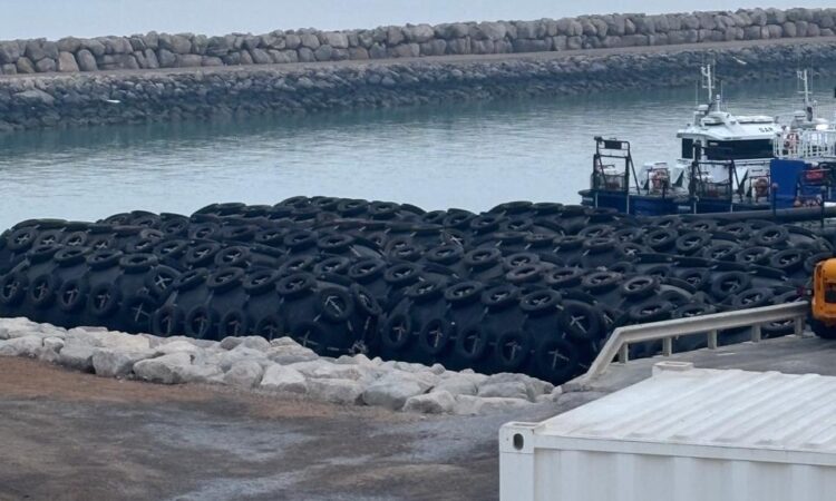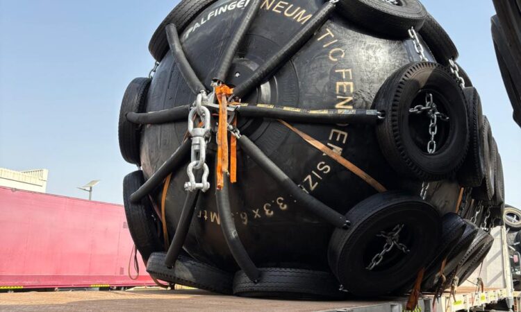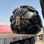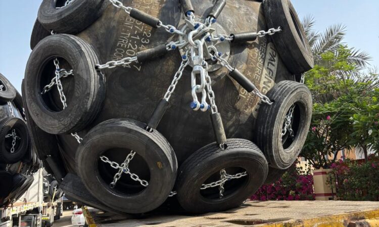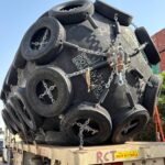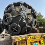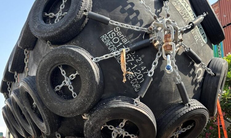 We also offer four (4) Palfinger brand marine pneumatic fenders of a smaller size. These units are equipped with galvanized chain and tire nets, including galvanized shackles and swivels. The fenders measure 1.5 meters in diameter and 3.0 meters in length, with an overall diameter of approximately 1.86 meters including tires. These fenders are manufactured in India and are in good condition, having been slightly used.