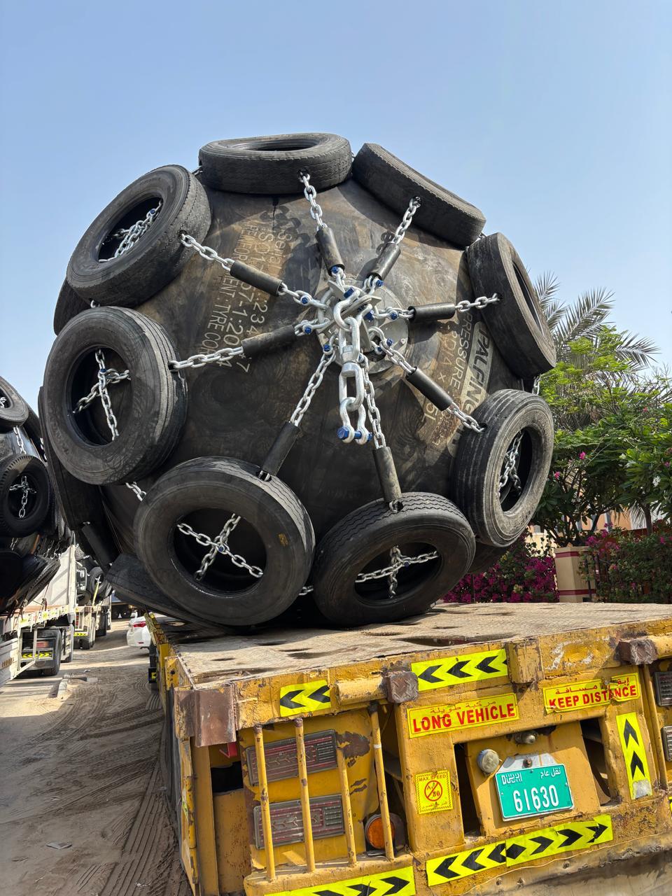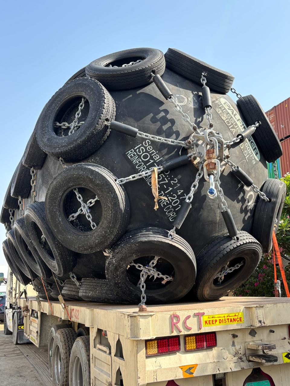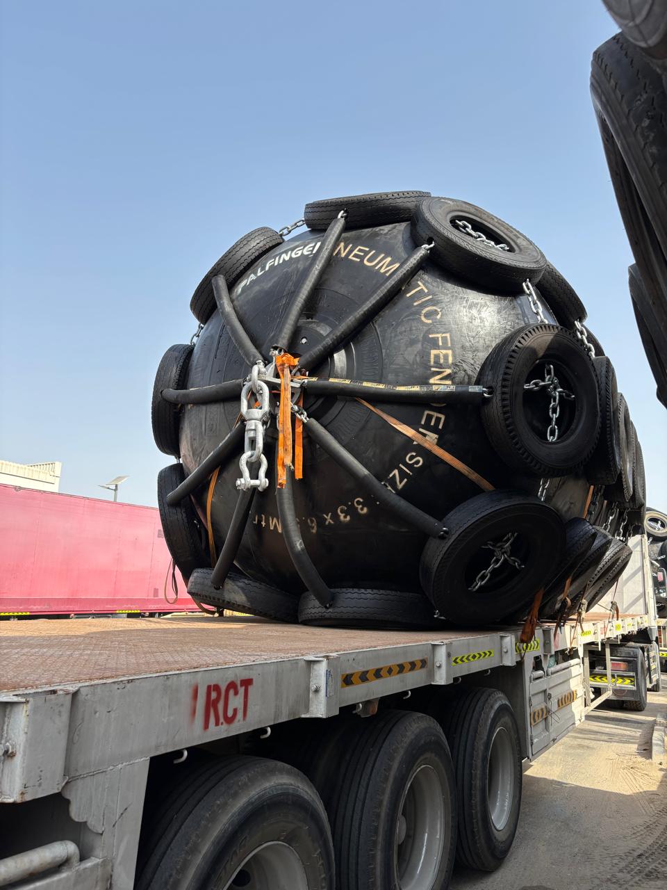 We have seventeen (17) Palfinger brand marine pneumatic fenders available for sale. Each unit is fitted with a galvanized chain and tire net, including galvanized shackles and swivels. The fenders have dimensions of 3300 mm diameter × 6500 mm length, with an overall diameter of approximately 3.8 meters including tires. These units are manufactured in South Korea and are in good condition, having been slightly used.