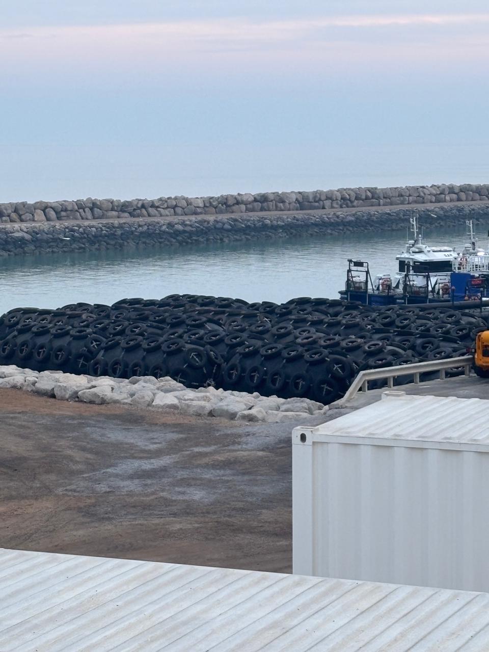 We also offer four (4) Palfinger brand marine pneumatic fenders of a smaller size. These units are equipped with galvanized chain and tire nets, including galvanized shackles and swivels. The fenders measure 1.5 meters in diameter and 3.0 meters in length, with an overall diameter of approximately 1.86 meters including tires. These fenders are manufactured in India and are in good condition, having been slightly used.